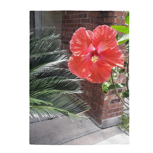 Velveteen Plush Blanket with Peach Hibiscus Flower Design