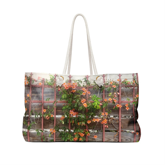 Flowers On A Rugged Fence | High Bloom Collection | Weekender Bag 24" x13" | Life By Ortavia